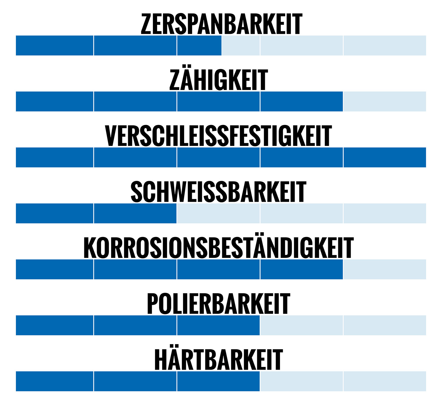 Seine Beliebtheit verdankt er der ausgezeichneten Balance zwischen Korrosionsbeständigkeit, einfacher Bearbeitung sowie guter Umformbarkeit bei gleichzeitig guter Festigkeit.