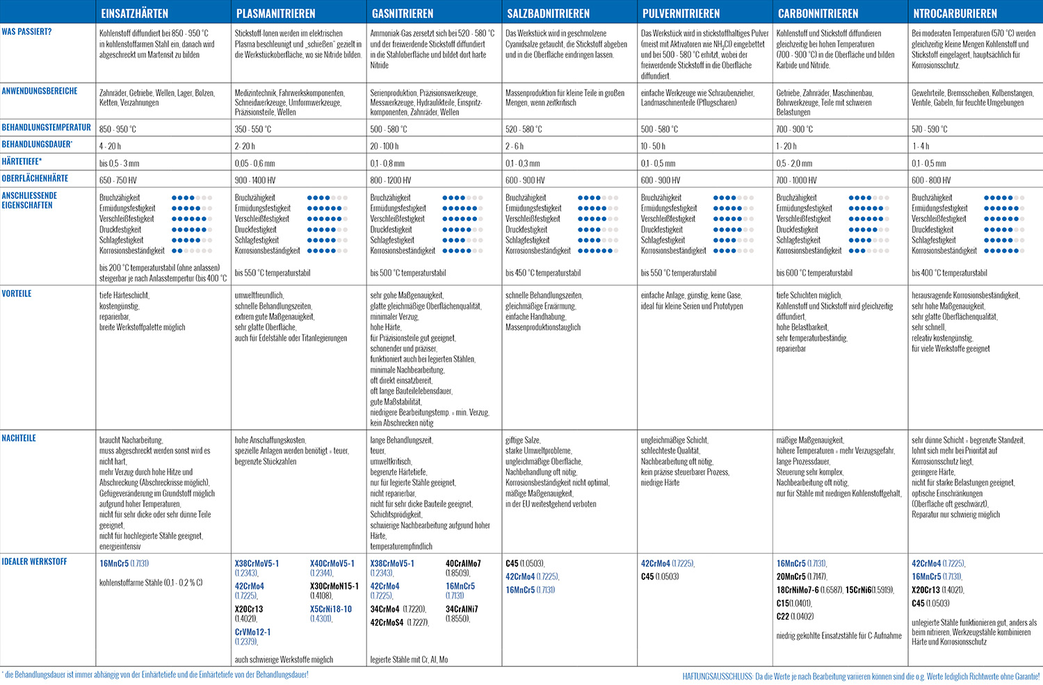 Das grundsätzliche Problem: Harter Stahl (hoher Kohlenstoffgehalt) ist oft verschleißfest, dafür spröde und bruchanfällig. Zähe Stähle (wenig Kohlenstoff), sind zwar bruchsicherer, aber dafür weich und verschleißen schneller. Viele Bauteile benötigen aber dennoch beide Eigenschaften, eine harte Oberfläche für höheren Verschleißschutz und einen zähen Kern für höhere Bruchsicherheit. Zu den wichtigsten Verfahren gehören Einsatzhärten, Nitrieren, Carbonitrieren und Nitrocarburieren - die Wahl hängt von den gewünschten Eigenschaften, der erforderlichen Einhärtetiefe und der Bauteilbelastung ab.